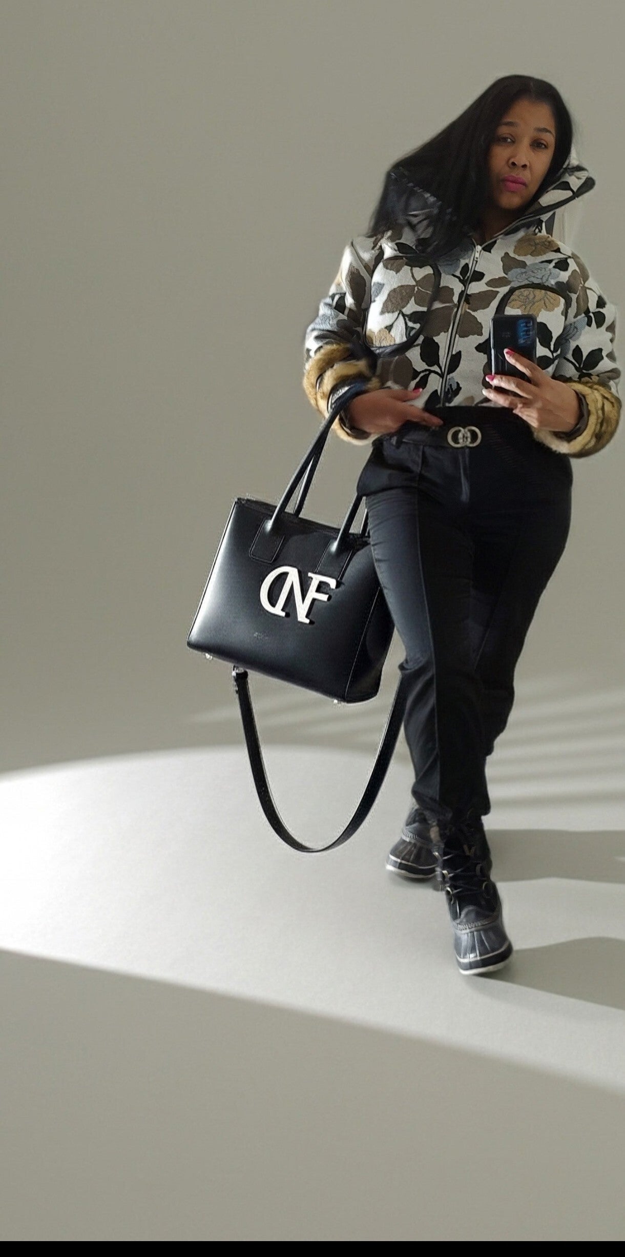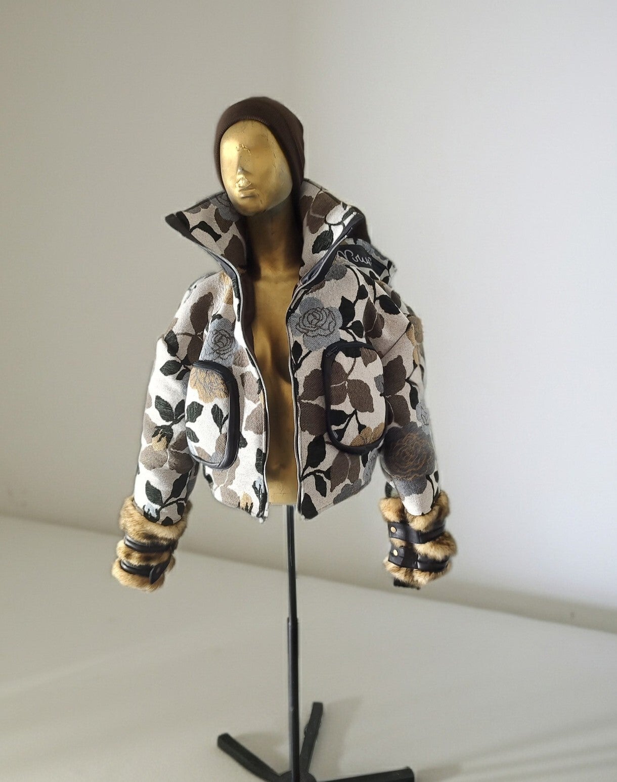 This beautiful multicolor floral print waist length jacket can fit a large through an extra large body frame, this jacket features a cozy lining to oop out the cold, it also zipper all the way up to the neck, it has faux fur featured around the arms with black vinyl straps to create a perfect fit, this beauty is a one of one custom designed From the Designer of the Deur Naiu F'eshene Brand