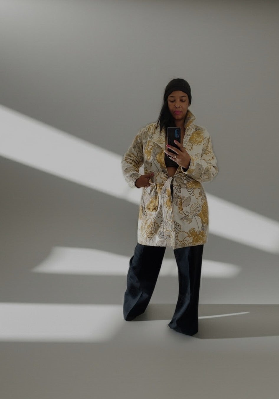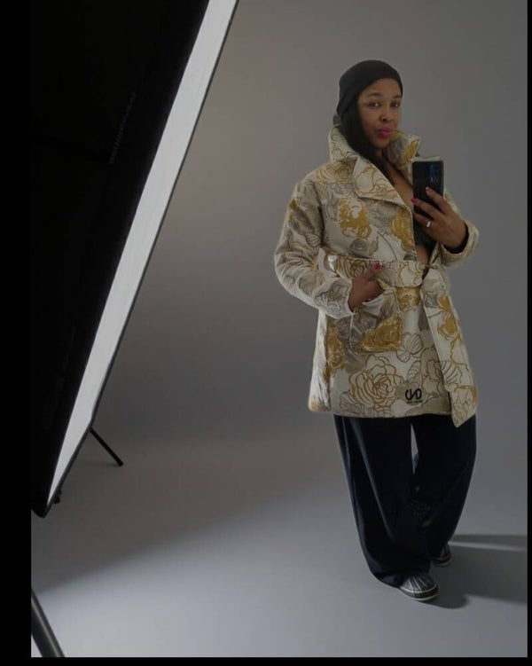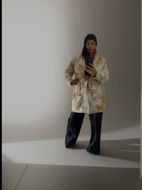 This amazing floral yellow and gray flower Coat is a 3/4 length stylish one of one Custom design By Naimah McCloud The Designer of The Deur Naiu F'eshene Brand, has style for days, it appealing to the eyes and was set any wardrobe on fire, it is amazing to the eyes the flow of it is sexy and it just makes a statement