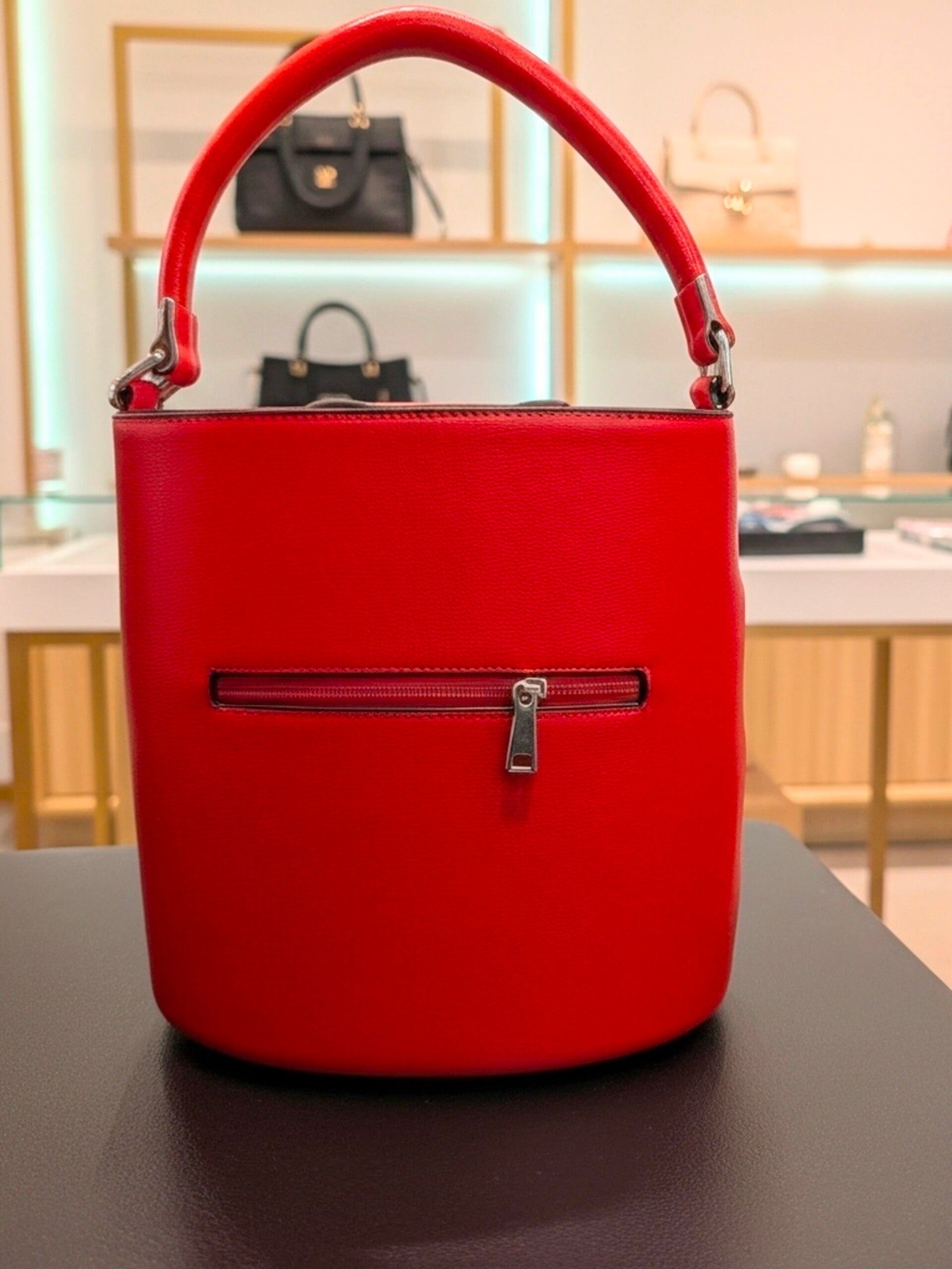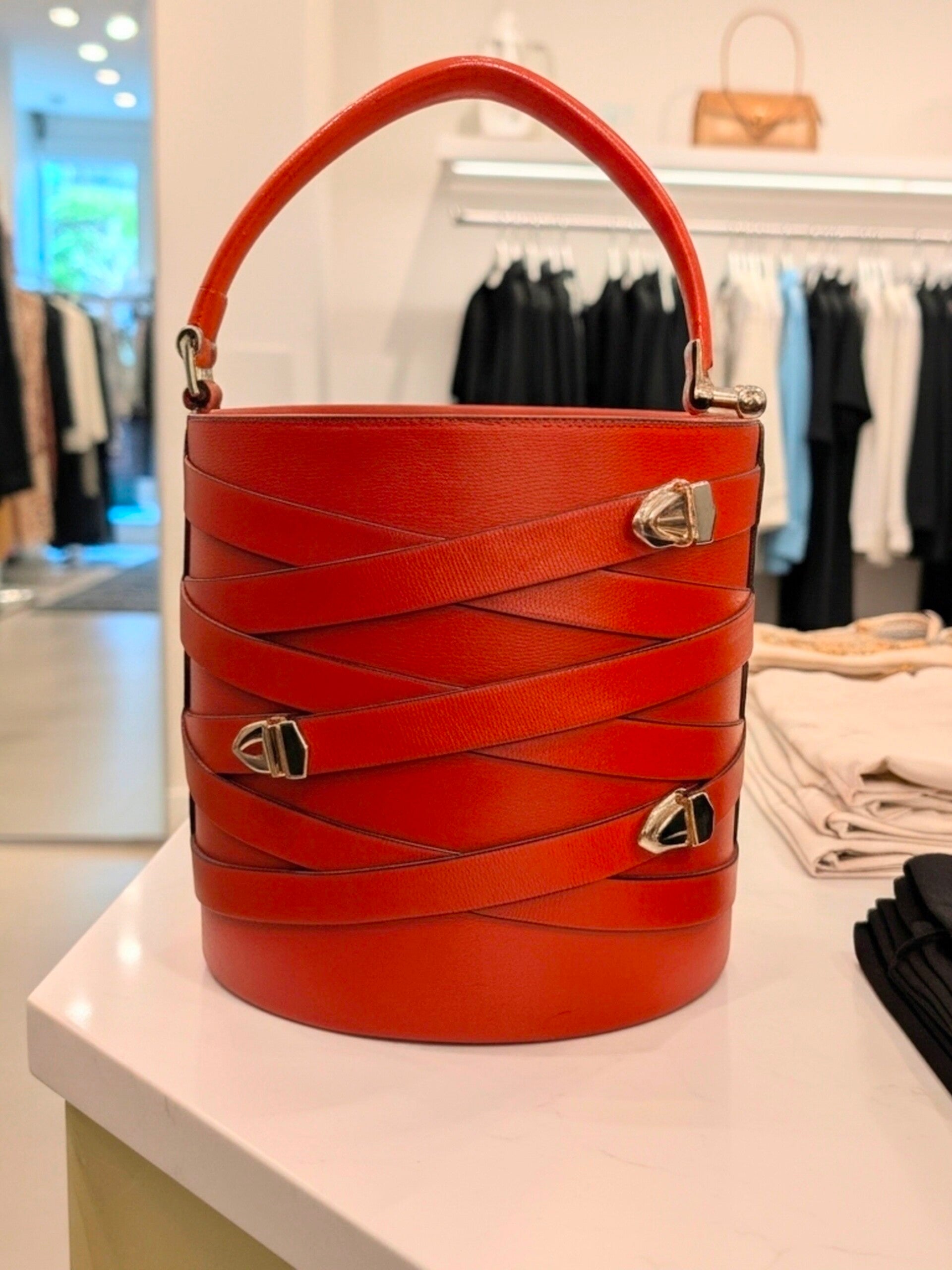 The alley handbag, is a large bucket style handbag with several straps and buckles, drawstring lining on the inside to secure all of your personal items, it also features a strap to give you the opportunity to move hands free