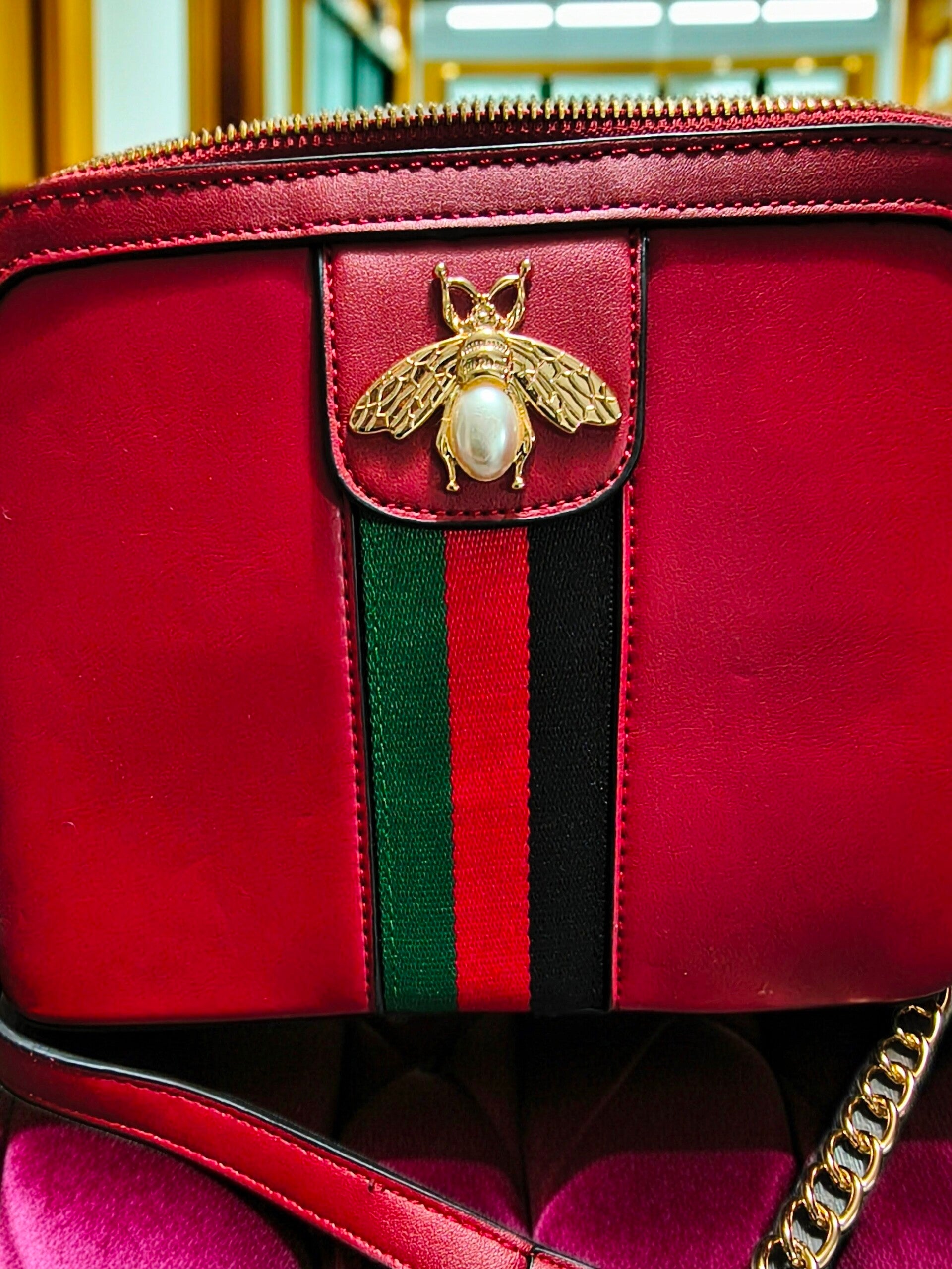 The Bee's Small Handbag, features a golden bumblebee, pendant, with a golden chain for a stylish look
