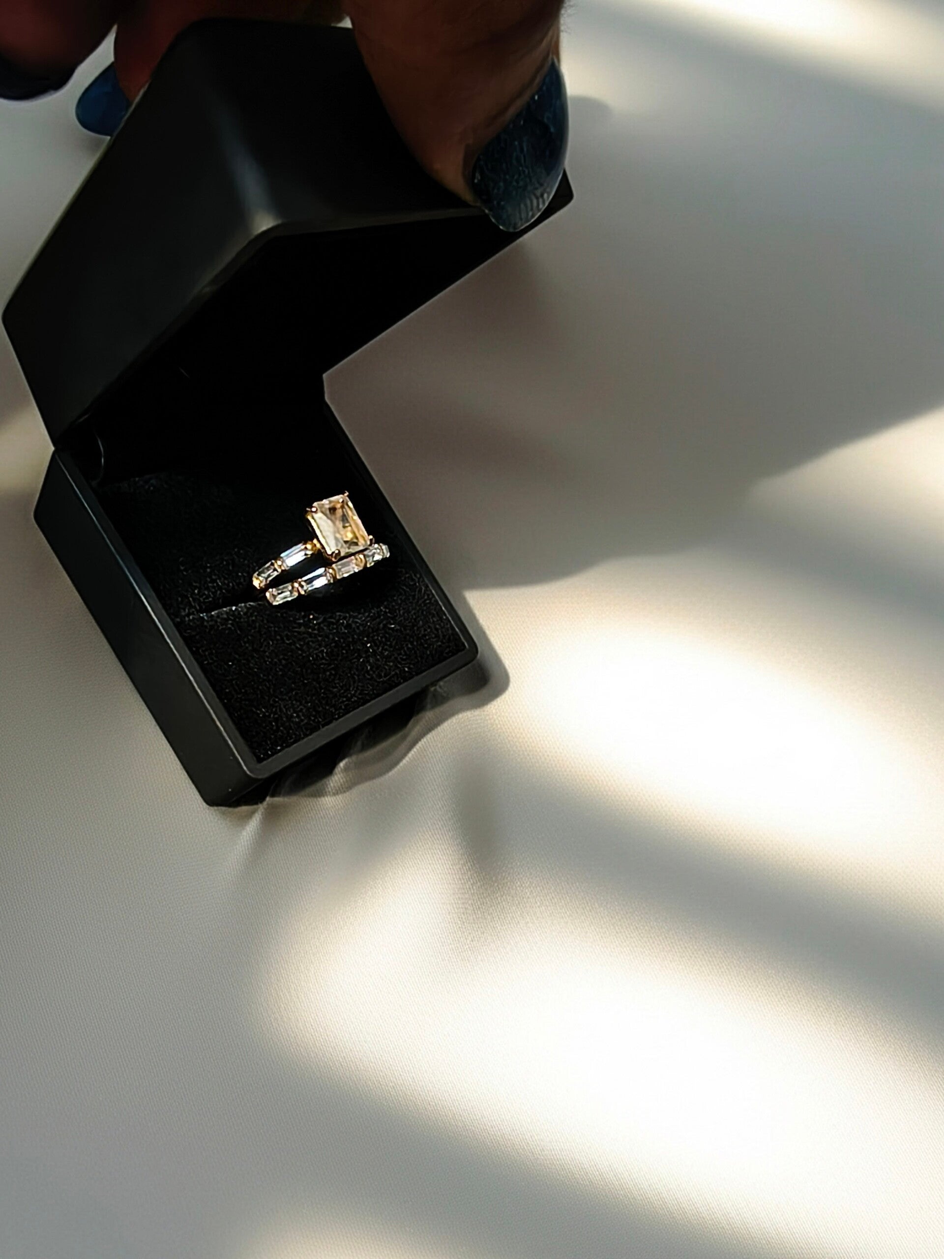 The double Crystal wedding ring is a ring that comes in silver or gold it's a two-piece with a lot of style to compliment your ring finger and bring out any wardrobe